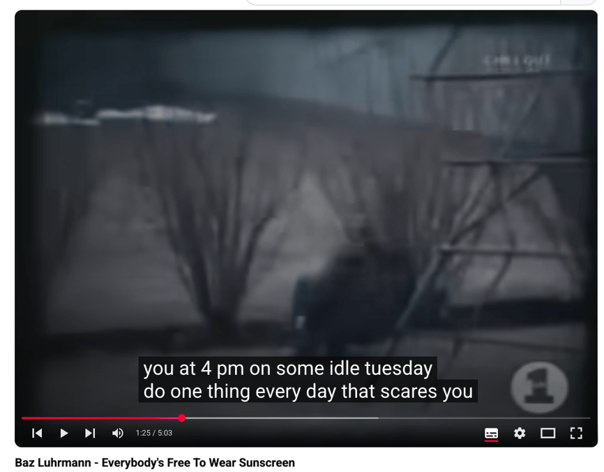 Quand je pense à la peur, et ça m’est venu d’un coup en écrivant cette newsletter, je repense à cette vidéo de Baz Luhrmann : Everybody’s free to wear sunscreen.